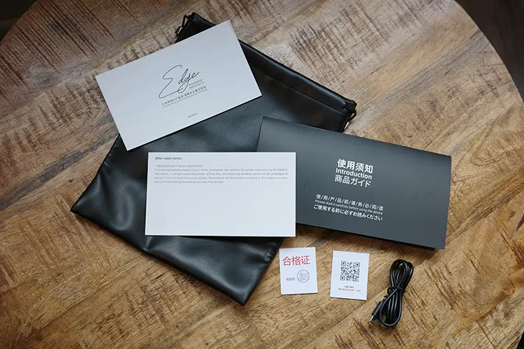 Above that, in the same gray color, is a rectangular box containing the USB-A to USB-C charging cable, a QR code for the app, a QC passed card, the warranty pamphlet, and a more involved owner’s manual, and the soft, supple pleather carrying bag that has soft fake suede in the inside.
