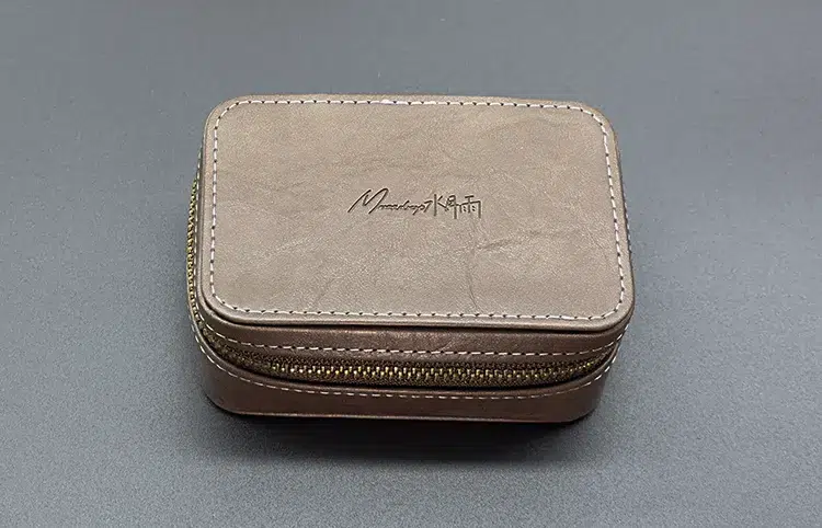 The carry case is a compact, rectangular, hard-shell design with a brown leather exterior. The top side features embossed branding with the Moondrop logo.