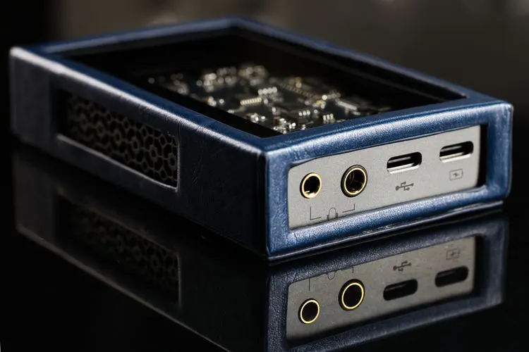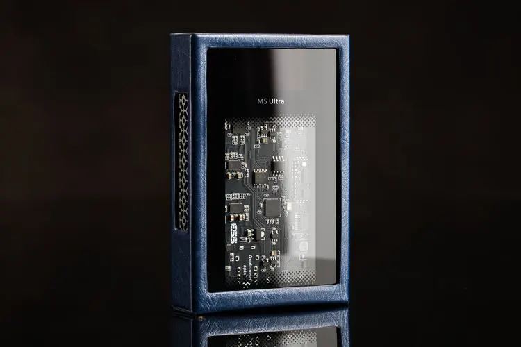 It is even more beautiful when the supplied leather protection case is used. The blue colored leather protection case for the M5 Ultra must be used at all times to protect the tempered glass back of the unit and soften the feel of the edges of the unit. It fits perfectly and exposes the control, vents, I/O, and front.
