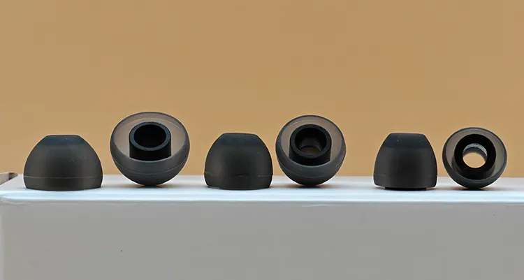 The included ear tips are a set of balanced silicone tips that come in three standard sizes. They use a soft black finish with a smooth outer texture and a slightly flexible inner stem for grip.